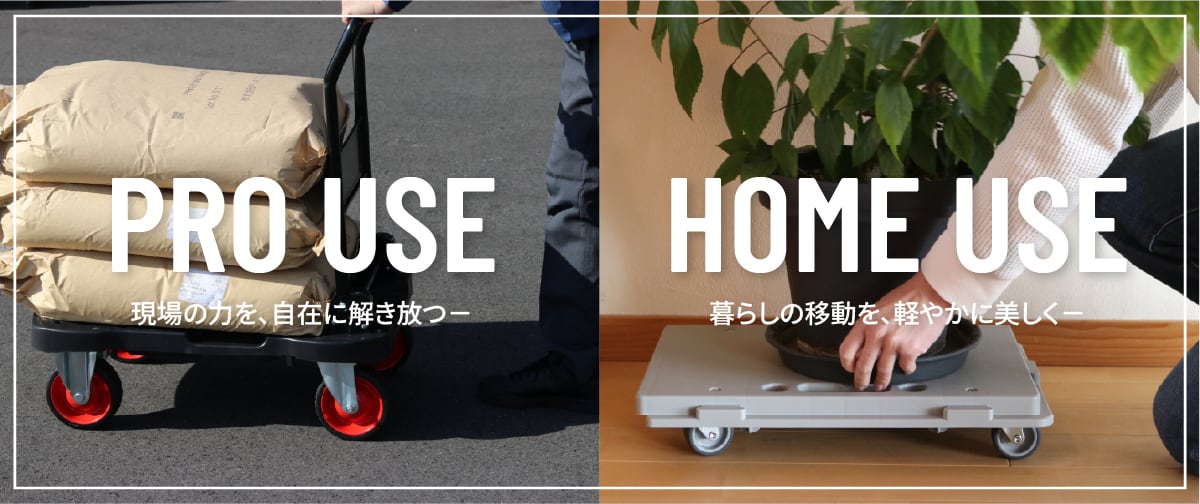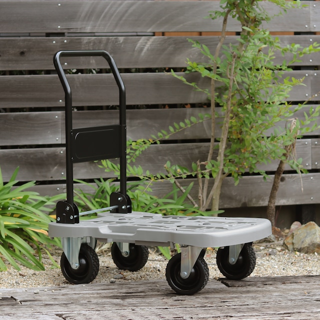 オフロードで使える頼もしさと軽快さを兼ね備えた都市型マルチ台車です。 スマートな見た目ながら、耐荷重150kgを実現。 凹凸のある路面も安定して走行でき、アウトドアや災害時にも活躍します。 ◇車輪径φ100mmのゴムタイヤで未舗装路・段差に強い ◇耐荷重150kgでしっかり運べる ◇曲げハンドル採用で楽に操作できる ◇ハンドルロック付で安全 ◇ハンドルを折りたためば平台車としても使える ◇滑り止めゴム4個付で荷物が安定 ◇持ち手が2か所あり、持ち運びも便利 多用途に使える、日本製の高品質台車です。 【サイズ】 ハンドル使用時:約幅600×奥行400×高さ860mm ハンドル折りたたみ時:約幅807×奥行400×高さ180mm (樹脂板高さ:約155mm) 【材質】 本体:PP(ポリプロピレン) ハンドル:スチール(粉体塗装) キャスター:ゴム 【製品重量】 約5kg 【耐荷重】 150kg 【キャスター】 φ100mmゴムタイヤ(前輪)自在×2(後輪)固定×2 【生産国】 日本 【備考】 完成品 *お使いのモニター環境により、実際の商品の色味と異なって見える場合がございます。 *表記サイズは製品により実物と誤差が生じることがございます。 *改良のため、予告なく仕様、デザイン、価格の変更または販売中止・生産中止となる場合がございます。
