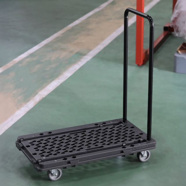 使用時のハンドル高さが89cmあり、腰をかがめずに楽な姿勢で押せるスリムな台車です。 約2.8kgとハンドル台車としては最軽量クラスで、持ち運びも楽々。 たたむとコンパクトになり、収納にも困りません。 ◇ハンドル高さ89cmで楽な姿勢で運搬可能 ◇ハンドル台車としては最軽量クラスの約2.8kg ◇樹脂板の幅がスリムな設計 ◇移動時に便利なキャリー機能搭載 ◇ハンドルロック付で安全 ◇エラストマーキャスターは衝撃吸収性・静寂性に優れ、床面への走行痕が発生しにくい 軽くて使いやすい、ショッピングやゴミ出しに最適な台車です 【サイズ】 ハンドル使用時:約幅435×奥行340×高さ890mm ハンドル折りたたみ時:約幅890×奥行340×高さ96mm 【材質】 本体:PP(ポリプロピレン)、ハンドル:スチール(粉体塗装)、キャスター:エラストマー 【製品重量】 約2.8kg 【耐荷重】 80kg 【キャスター】 φ50mmエラストマー(前輪)自在×2(後輪)固定×2 【生産国】 中国 【備考】 完成品 *お使いのモニター環境により、実際の商品の色味と異なって見える場合がございます。 *表記サイズは製品により実物と誤差が生じることがございます。 *改良のため、予告なく仕様、デザイン、価格の変更または販売中止・生産中止となる場合がございます。