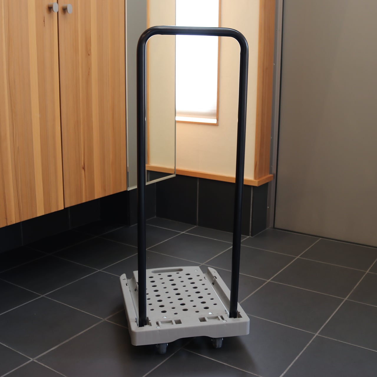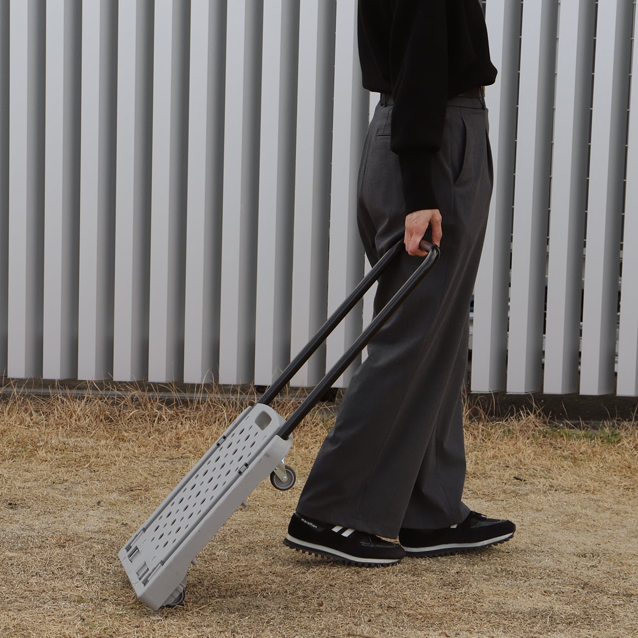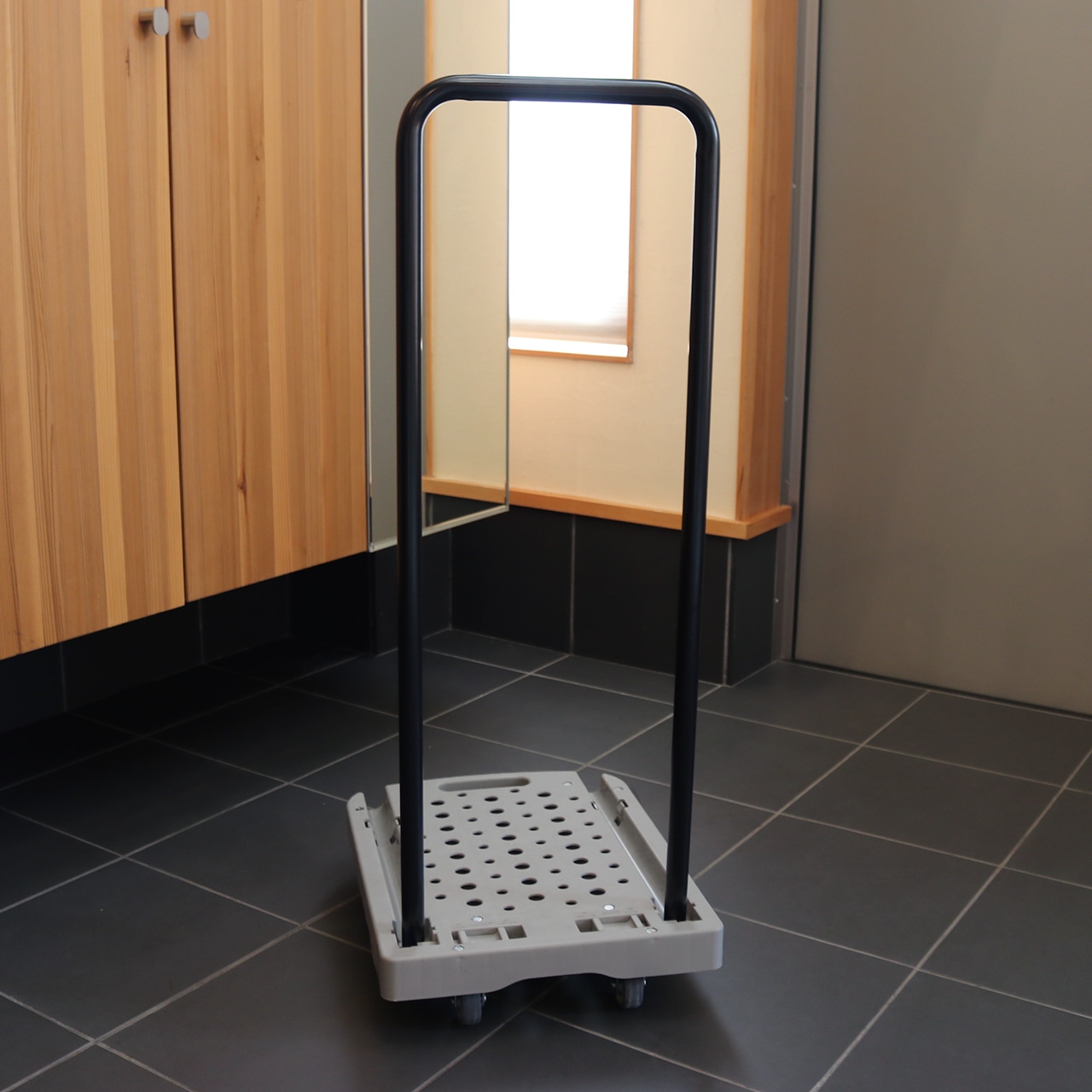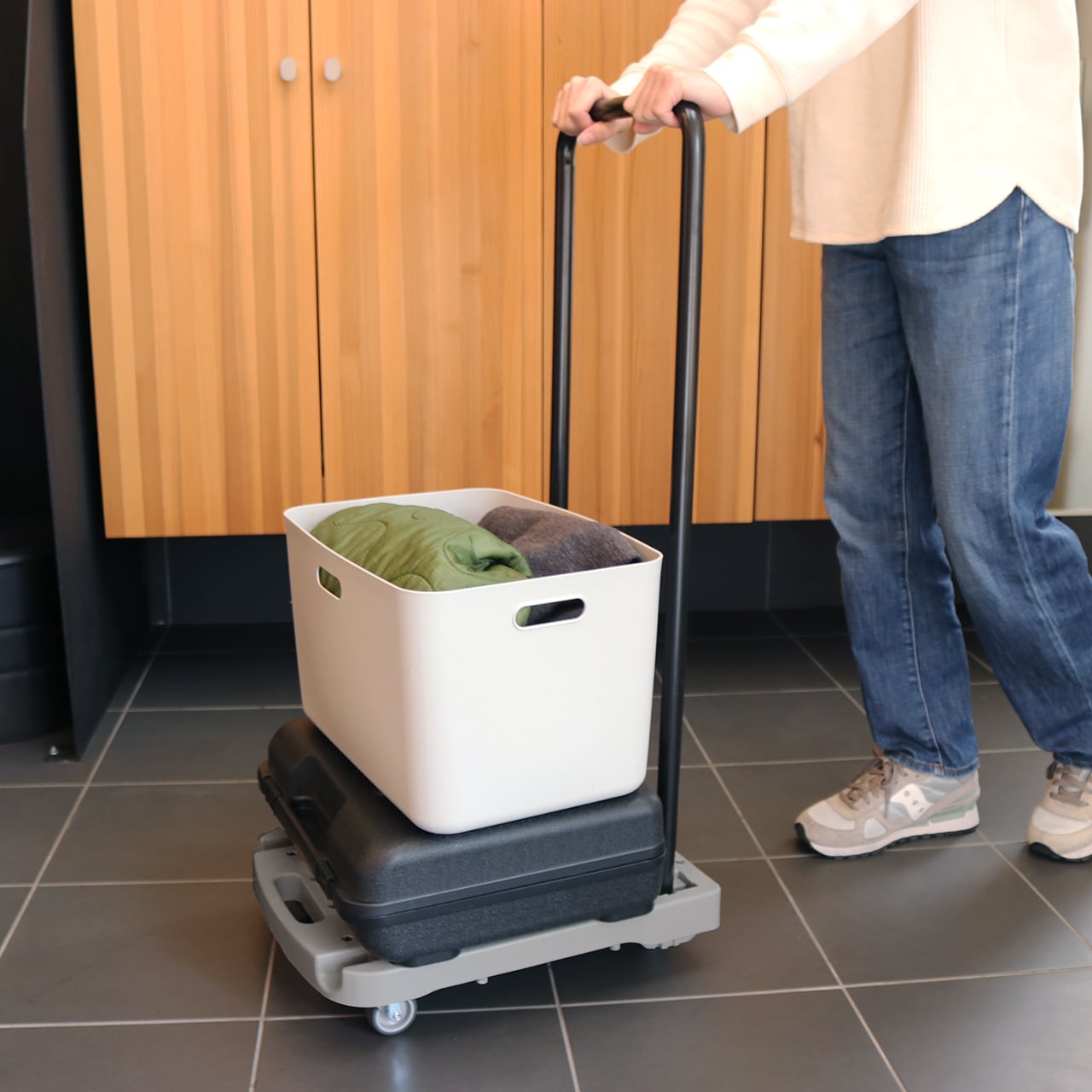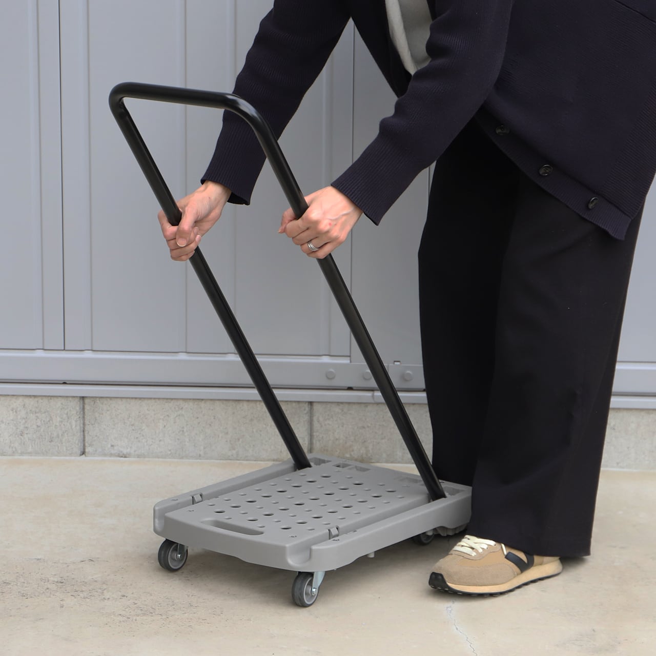 使用時のハンドル高さが89cmあり、腰をかがめずに楽な姿勢で押せるスリムな台車です。