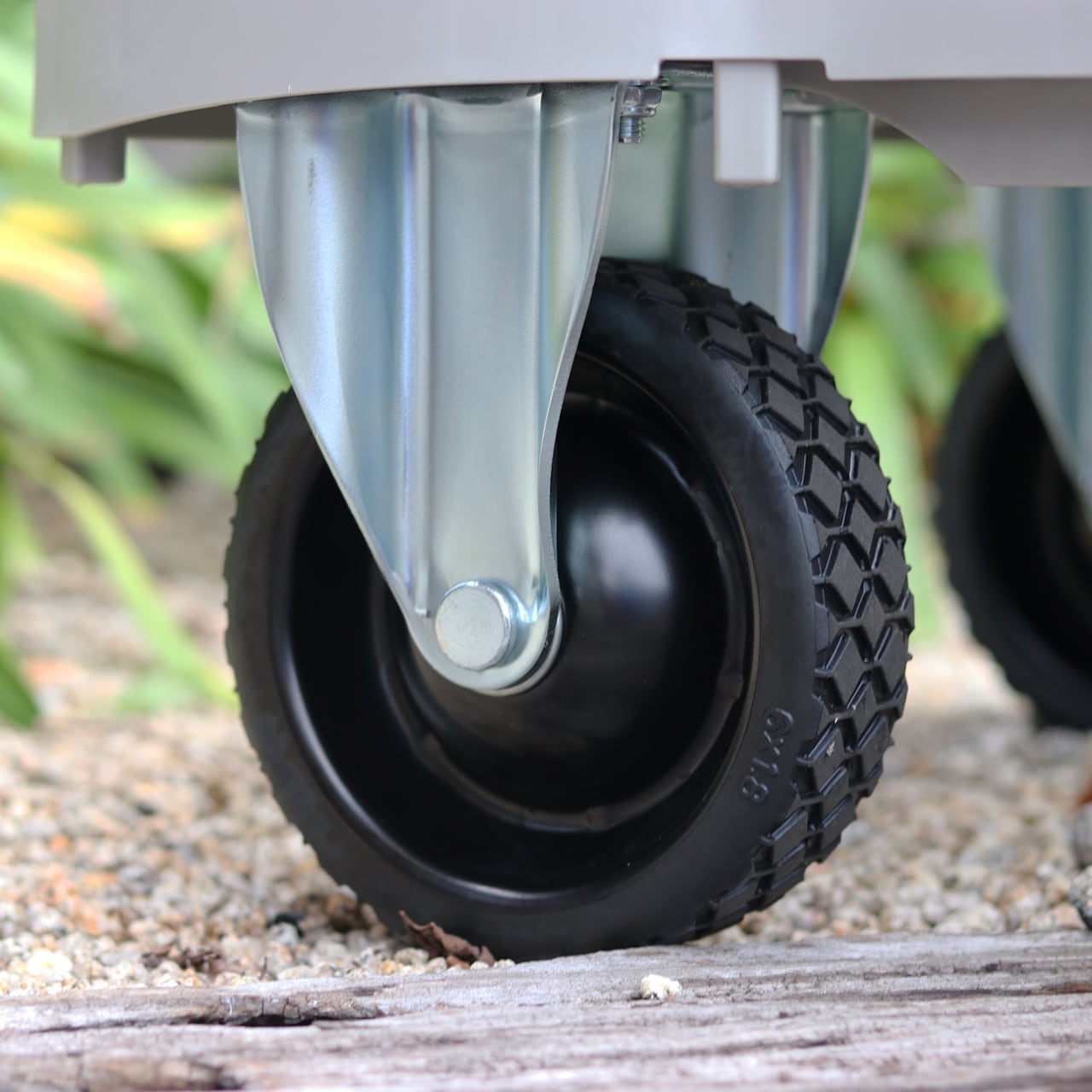 ◇車輪径φ150mmの大型ゴムタイヤで未舗装路・段差に強い