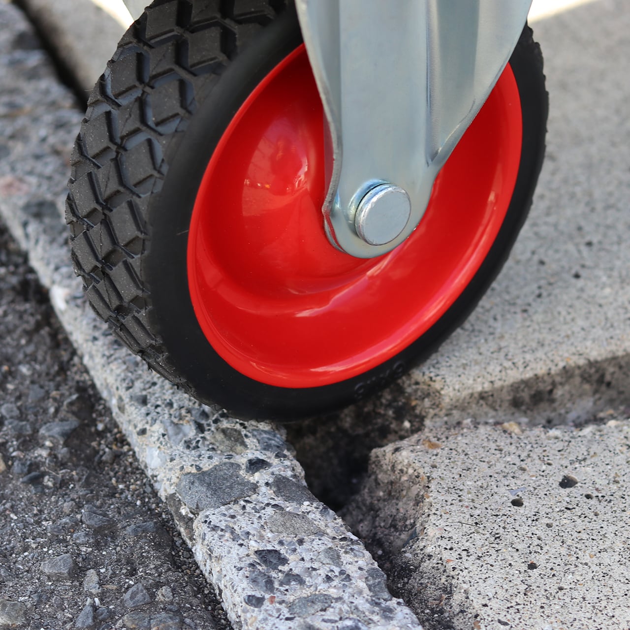 ◇車輪径φ150mmの大型ゴムタイヤで未舗装路・段差に強い
